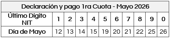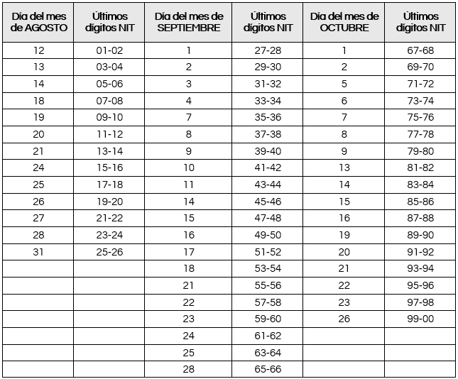- Personas Naturales (Declaración y pago): Los vencimientos inician el 12 de agosto y finalizan el 26 de octubre de 2026, según los dos últimos dígitos del NIT: